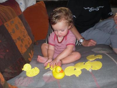 Neulich hab ich die Gelbe beim spazieren gehen aus dem Kinderwagen geschmissen und wir haben sie nicht mehr gefunden. Das hat mich so geschockt, dass ich einen Tag lang nix mehr gesagt hab. Mom meint, ich hab mein(e) Wort(e) mitsammt der Ente rausgeschubbst.